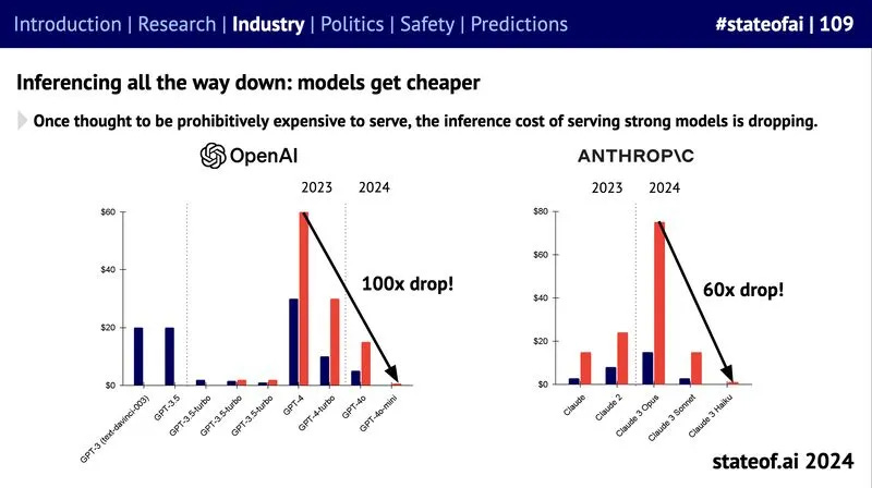 The good news? Inference is getting dramatically cheaper. As models improve and infrastructure gets optimized, the cost per query has fallen off a cliff. OpenAI saw a 100x drop, and Anthropic a 60x drop in just one year.